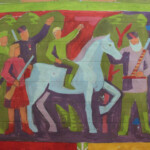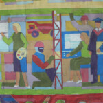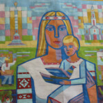 Темная по настроению и цвету полоса сменяется светлой, на которой умелицы с присущей им кропотливостью нарисовали нитками насыщенную жизнь горожан и сельчан. В «деревенской» части гобелена мы видим привычные будни тружеников села, а в «городской» – повседневную жизнь представителей самых разных профессий. Всматриваешься в гобелен – и образы мирной жизни словно оживают, наполняются народными мелодиями, гулом машин, шелестом колосьев и клокотанием аиста. Сельчанка со снопом, музыкант, ученый, художник, строитель – каждый персонаж, по словам авторов произведения, попал на полотно неслучайно.